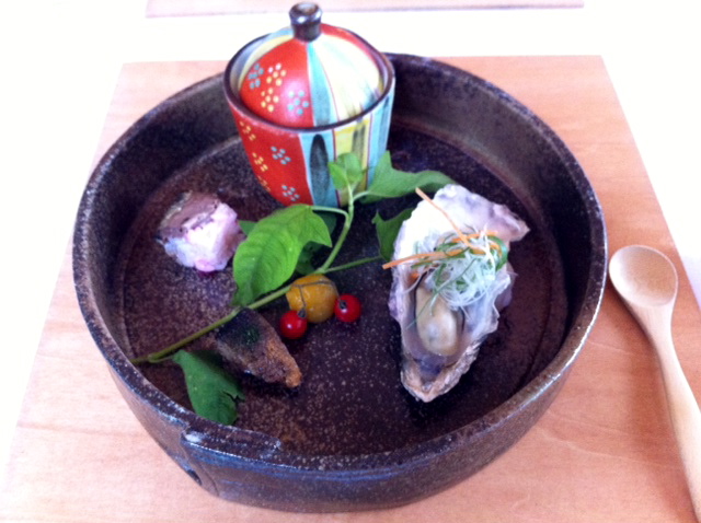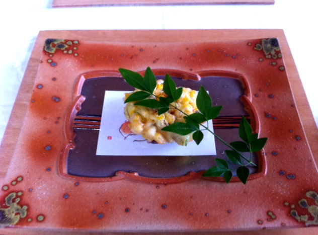 先付 唐黍と穴子の掻き揚げ、 紫蘇の香り