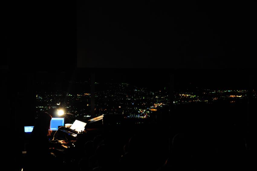 会場が少しづつ暗くなってきて、夜景がガラス越しに浮かびあがってきました。