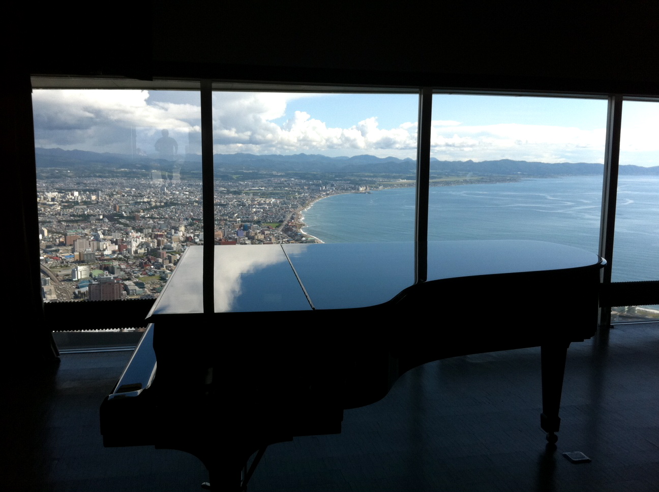ピアノの横はガラス張りで一面に函館市内と海が一望出来るのです。