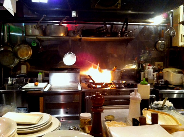 お店の人に、「あの、火が出てます。」と一応言ってみる。
